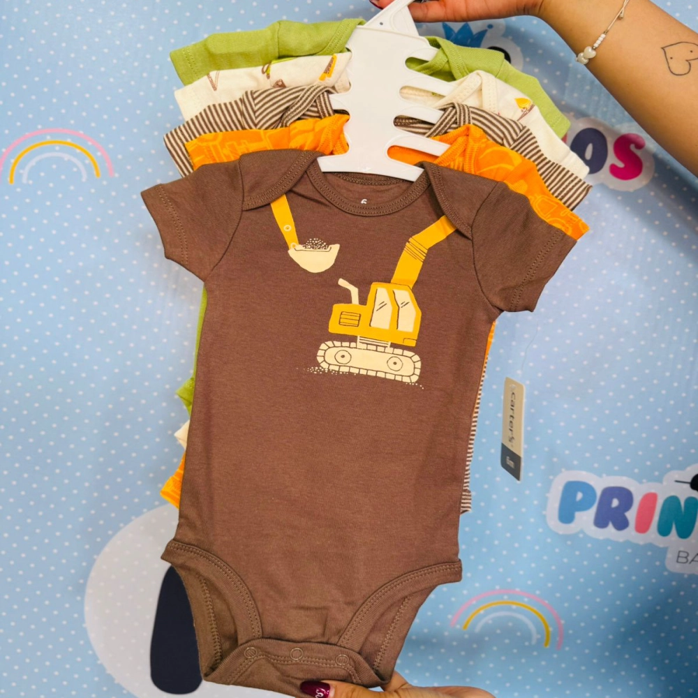 Un set divertido y lleno de energía para los pequeños constructores de sueños ✨. Este pack de 5 bodies manga corta viene en tonos tierra, verdes y naranjas con diseños inspirados en maquinaria y estampados modernos, perfectos para darle un toque único al look diario de tu bebé.
