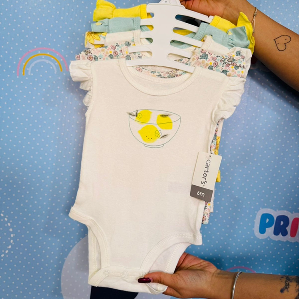 Hermoso set de 5 bodies sin mangas para bebé, con diseños frescos y divertidos en tonos blanco, amarillo, verde y estampados florales. Cada body tiene detalles únicos como volantes en los hombros y estampados tiernos, perfectos para la temporada de calor. Están confeccionados en 100% algodón, lo que los hace suaves, cómodos y transpirables. Cuentan con broches inferiores que facilitan el cambio, ideales para el uso diario manteniendo a tu bebé fresco y con estilo.