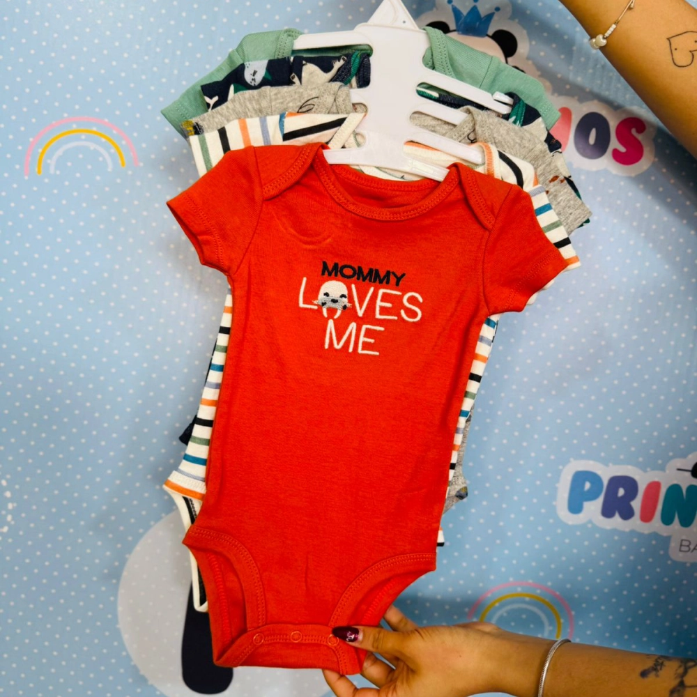 Set de 5 bodies de manga corta para bebé, en colores y estampados divertidos y modernos. Incluye diseños con rayas, tonos neutros y un tierno body rojo con la frase “Mommy Loves Me”. Están confeccionados en algodón suave, ideales para mantener a tu bebé cómodo y fresco en todo momento. Los broches inferiores facilitan el cambio de pañal, convirtiéndolos en una prenda práctica y funcional para el día a día. Perfectos para combinar y darle un estilo adorable a tu pequeño.