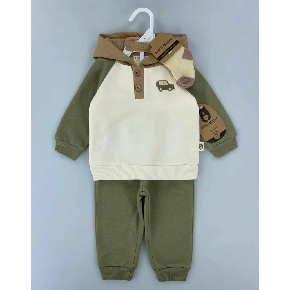 Conjunto infantil de tres piezas compuesto por buzo con capucha en tonos beige y verde oliva, con botones frontales decorativos y un pequeño bordado de camioneta, acompañado de pantalón a juego con pretina y puños elásticos, más un par de medias en tonos coordinados. Una prenda cómoda, práctica y con un diseño divertido para el uso diario.