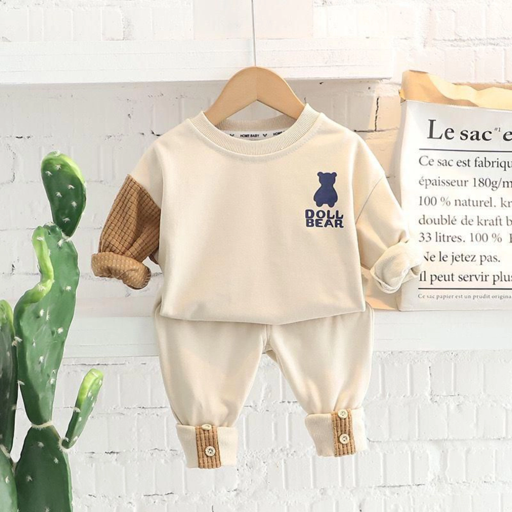 Sudadera beige con detalles marrones en mangas y pantalón beige con botones en los tobillos.