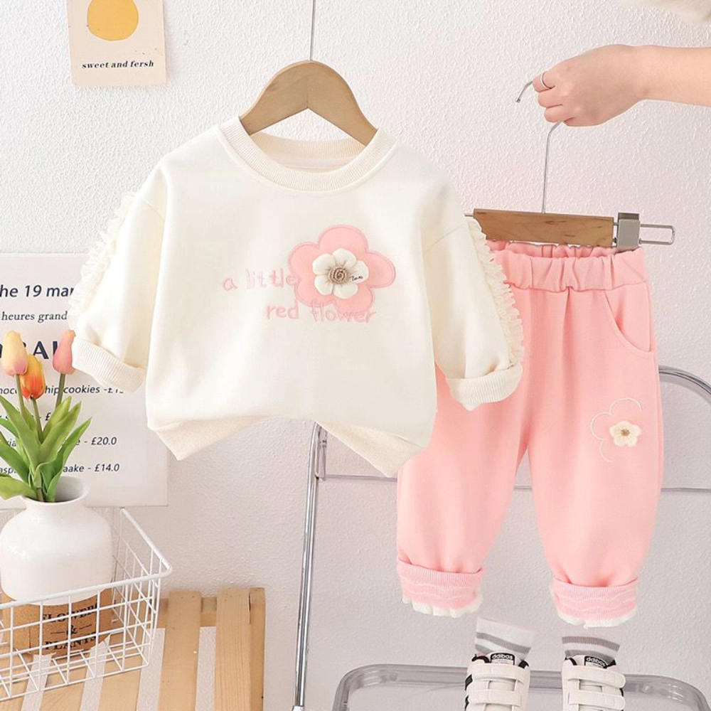 Sudadera beige con detalle de flor 3D y la frase “a little red flower”, acompañada de pantalón rosa con bordado de flor y cintura elástica. Un look dulce y cómodo para tu pequeña.