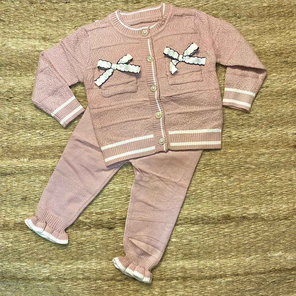 Conjunto infantil tejido de dos piezas en tono rosa. Incluye suéter tipo chaqueta con botones al frente, bolsillos decorativos y lazos blancos que realzan su diseño delicado. El pantalón a juego cuenta con puños elásticos con volantes que aportan un detalle encantador. Suaves, cómodos y elegantes, perfectos para mantener a los pequeños abrigados con estilo.