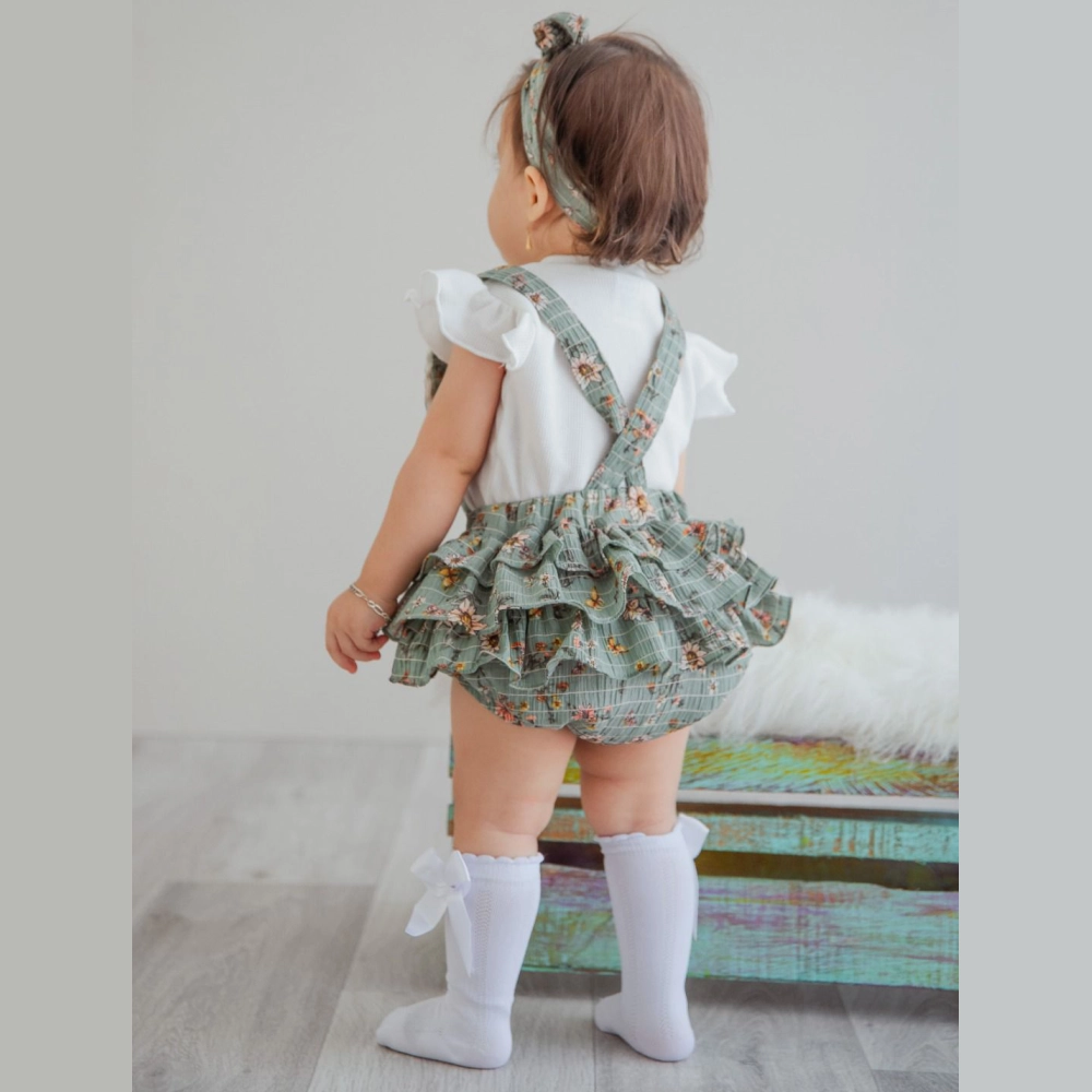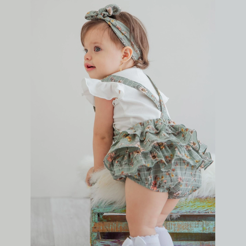Conjunto para niña compuesto por blusa blanca de manga corta con volantes, enterizo estilo jardinera con estampado floral y volantes laterales, además de moño para el cabello a