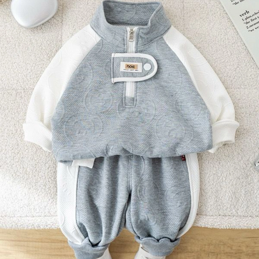 conjunto con cremallera al pecho en tono gris con mangas blancas, combinada con pantalón jogger gris con detalles laterales. Ideal para un look cómodo y moderno en cualquier ocasión.