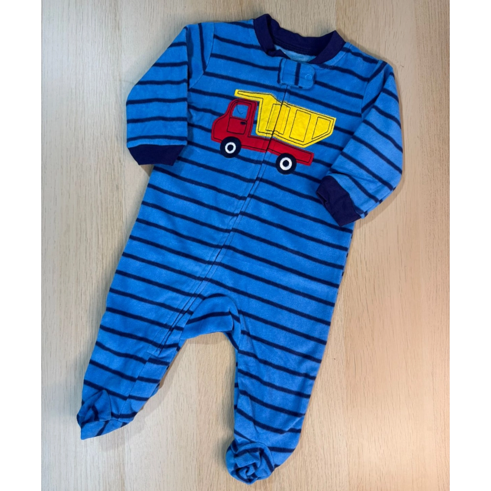 pijama azul con rayas marinas y diseño de camión rojo y amarillo al frente, cierre frontal con piecitos incluidos.