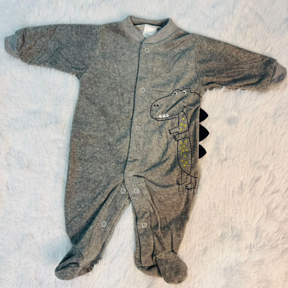Pijama gris con diseño de dinosaurio en el costado y detalles de crestas negras en la espalda.