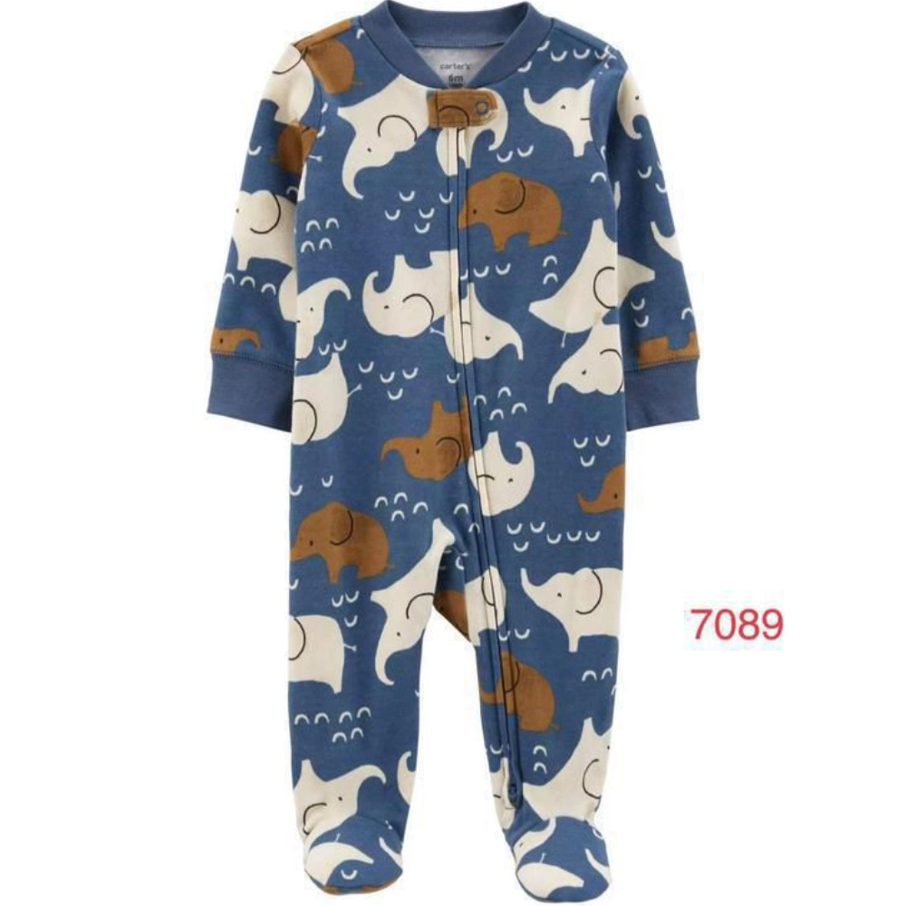 Pijama azul con estampado de elefantes blancos y cafés, cierre frontal y piecitos incluidos.
