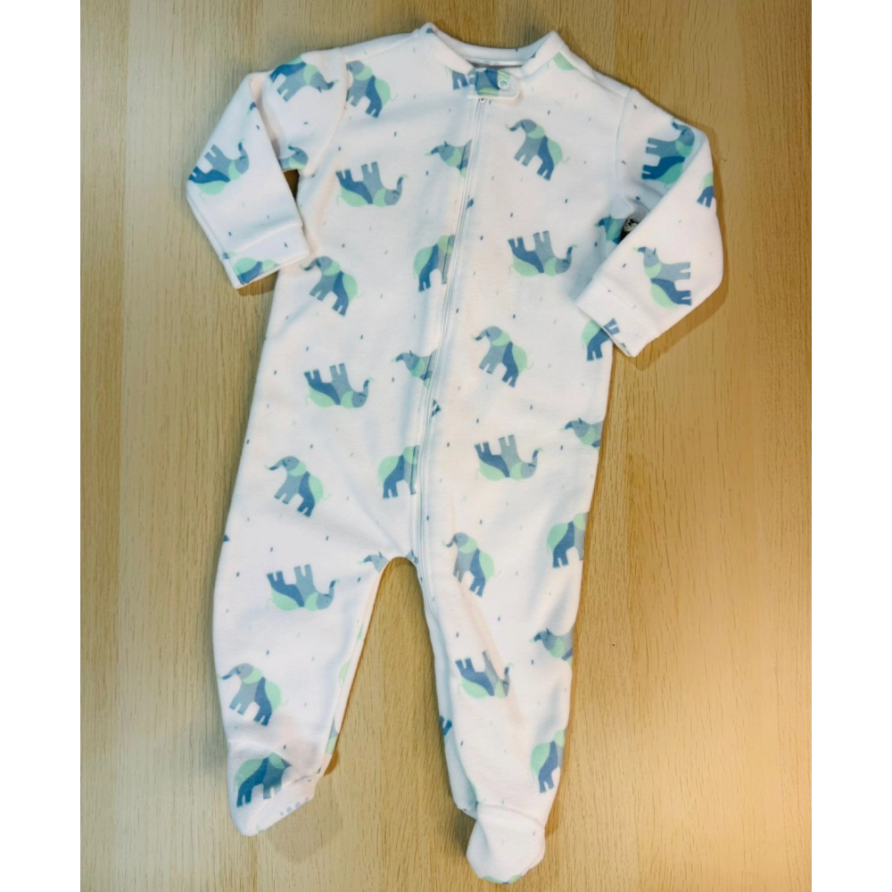 pijama blanco con estampado de elefantes en tonos azul y verde, cierre frontal con piecitos incluidos.
