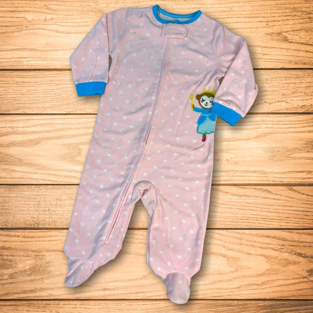 pijama rosa con pequeños corazones blancos, detalles en azul y bordado de monita con corona y vestido.