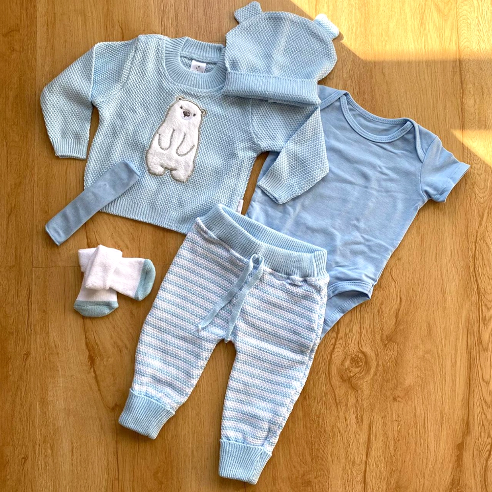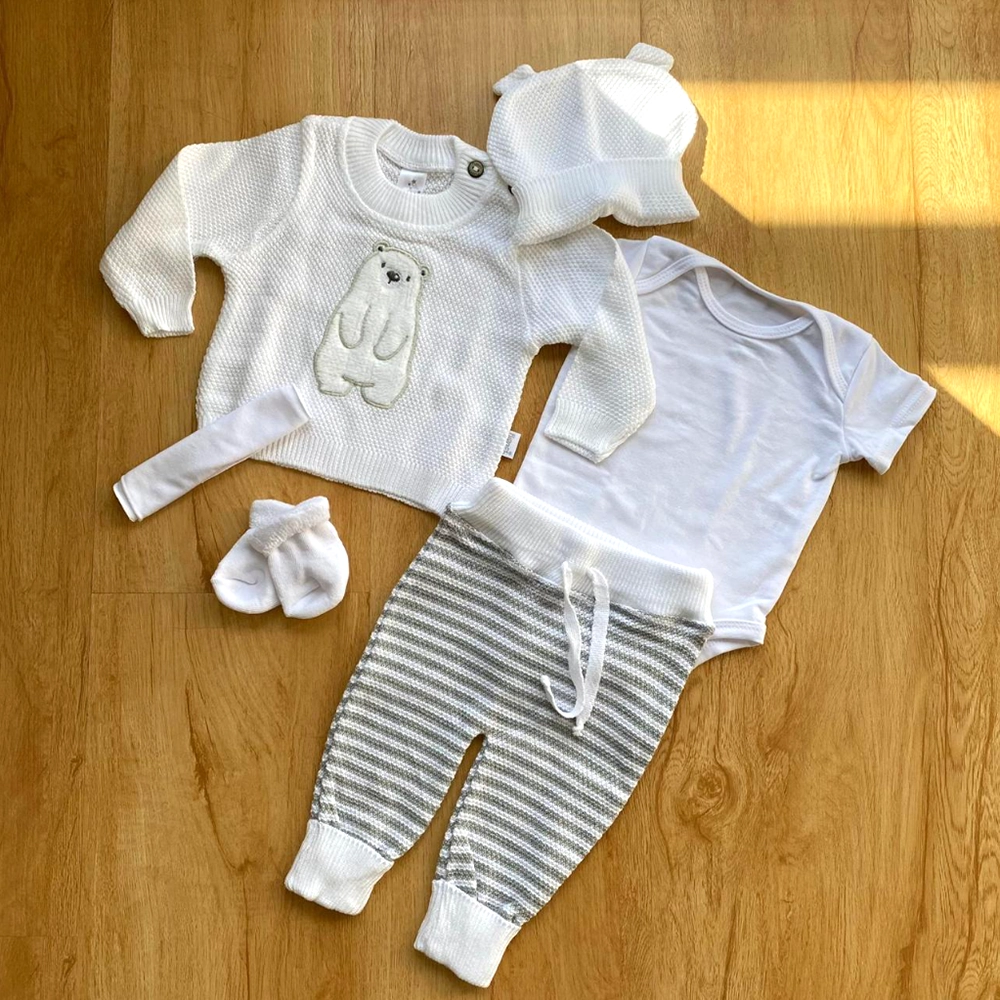 Conjunto tejido en blanco y gris con diseño de osito polar, ideal para el primer día del bebé.