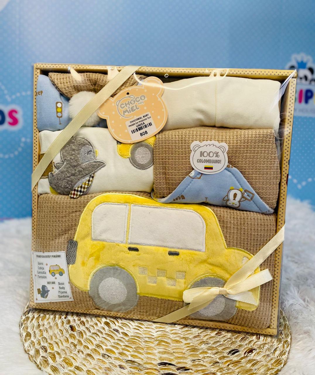 Un set lleno de ternura que incluye body, buzo, gorro, cobija, pijama, pantalón, bandana y camisilla, todo con detalles suaves y un tierno taxi amarillo que invita a vivir las primeras aventuras con total comodidad. Ideal para regalar y enamorar a primera vista. 🚕💛👶🏼