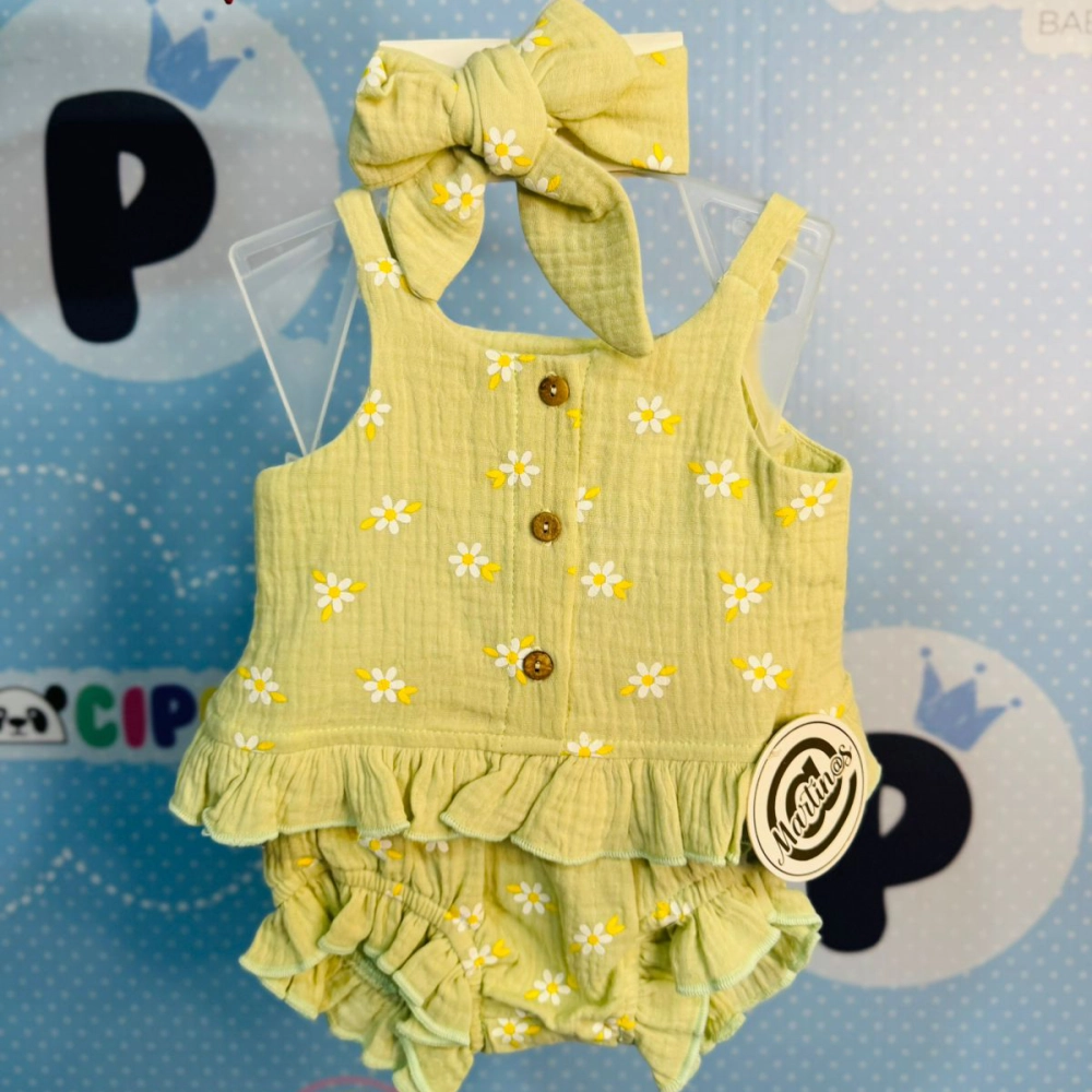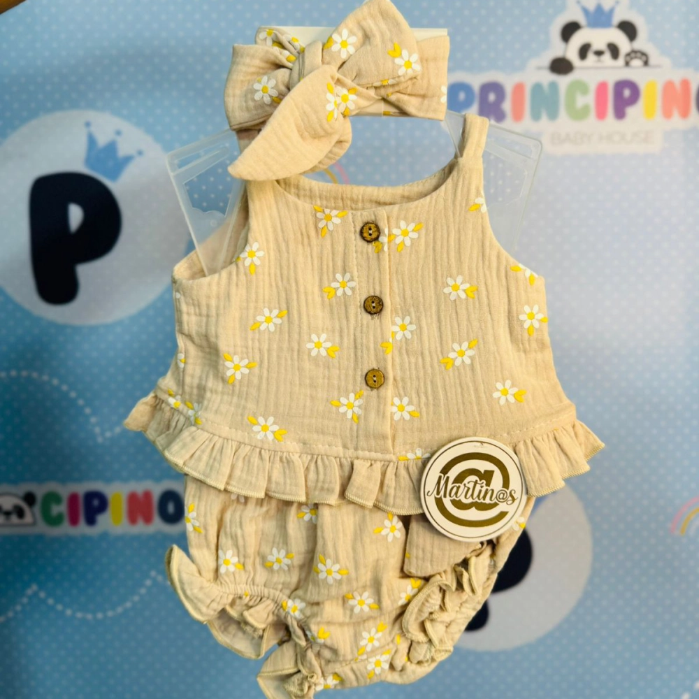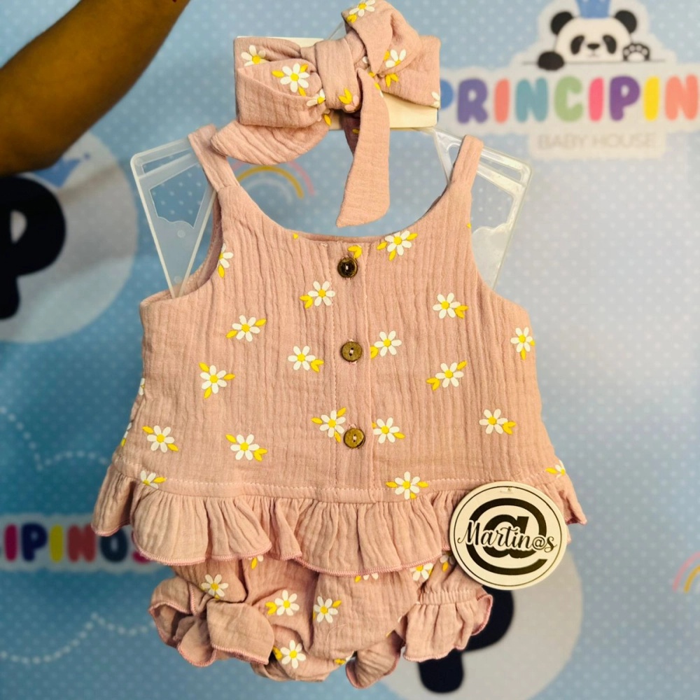 Conjunto para niña de tres piezas que incluye blusa sin mangas con botones y estampado de margaritas, bloomers con olanes y diadema con moño grande, disponible en color rosa viejo, beige y verde pistacho en tallas 6, 9, 12 y 18 meses.