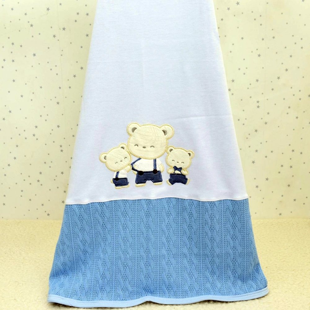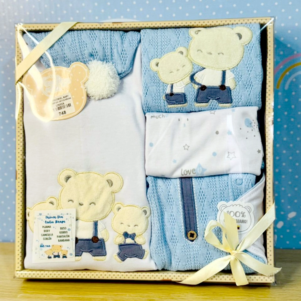 Conjunto en tonos azul y blanco con adorables ositos bordados. Incluye pijama, body, buso, gorro, camisilla, pantalón, cobija y bandana. Viene en caja con lazo, perfecto para regalo.