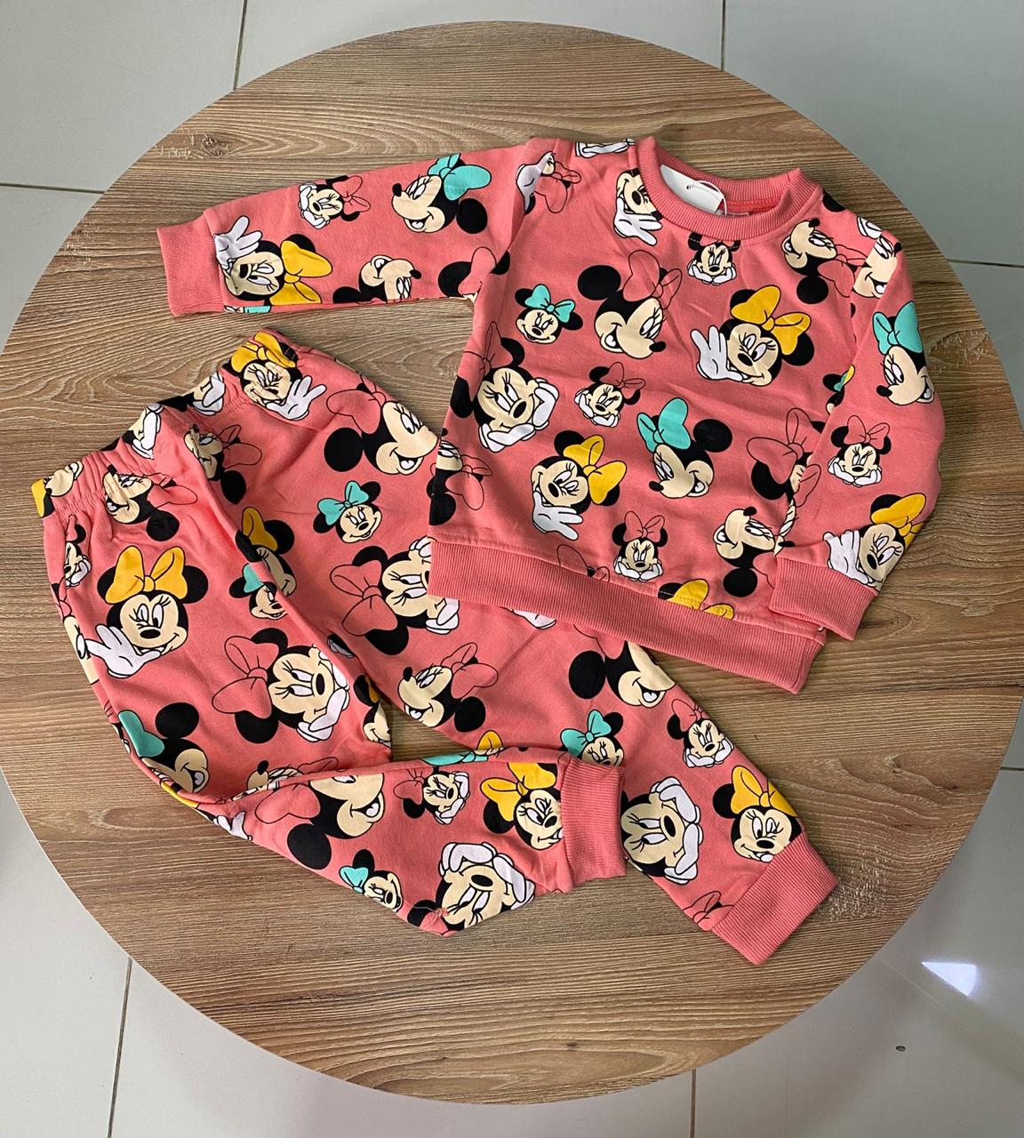 Conjunto infantil de dos piezas en tela suave tipo algodón, compuesto por buzo y pantalón en tono rosa salmón con estampado completo de un personaje animado estilo Minnie en diferentes expresiones y colores vibrantes como amarillo, verde menta y rosa. El buzo tiene puños y pretina acanalados para mejor ajuste, y el pantalón cuenta con cinturilla elástica para mayor comodidad. Ideal para niñas por su diseño tierno, cómodo y muy llamativo.