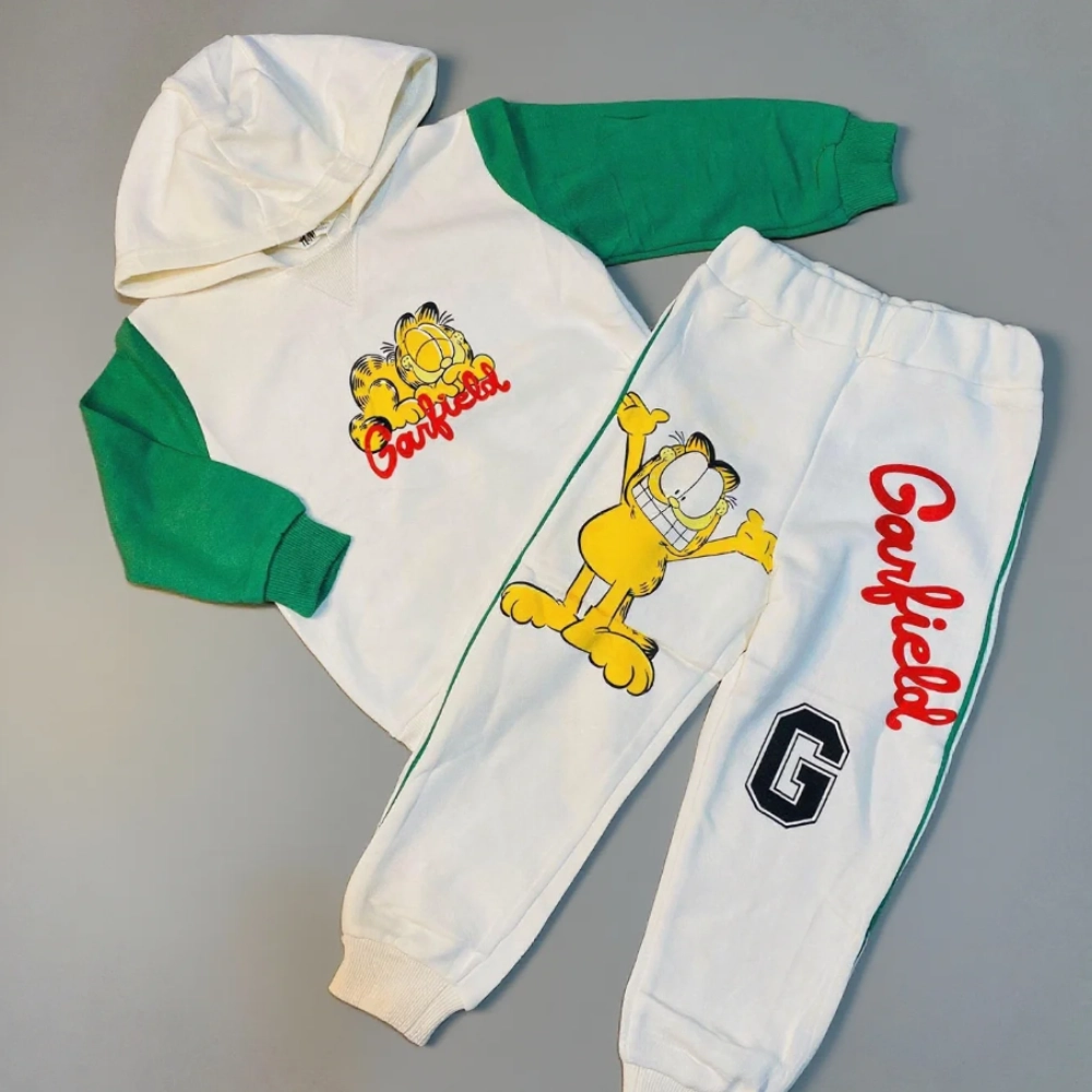 Sudadera con capucha y pantalón en color blanco con mangas verdes, estampado de Garfield y letras en rojo. Cómodo, divertido y perfecto para los pequeños fans del gato más famoso.