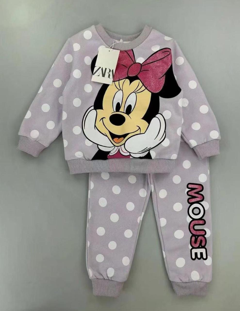 conjunto infantil de dos piezas que combina un diseño divertido y cómodo, ideal para el vestuario casual de invierno. El set se presenta en un tono lila con un patrón de grandes puntos blancos en toda la tela de la sudadera y el pantalón. La sudadera de cuello redondo lleva un gran estampado de Minnie Mouse con un lazo brillante, mientras que el pantalón jogger complementa con la palabra “MOUSE” estampada verticalmente. Es una prenda de la marca Zara que ofrece calidez y un estilo encantador