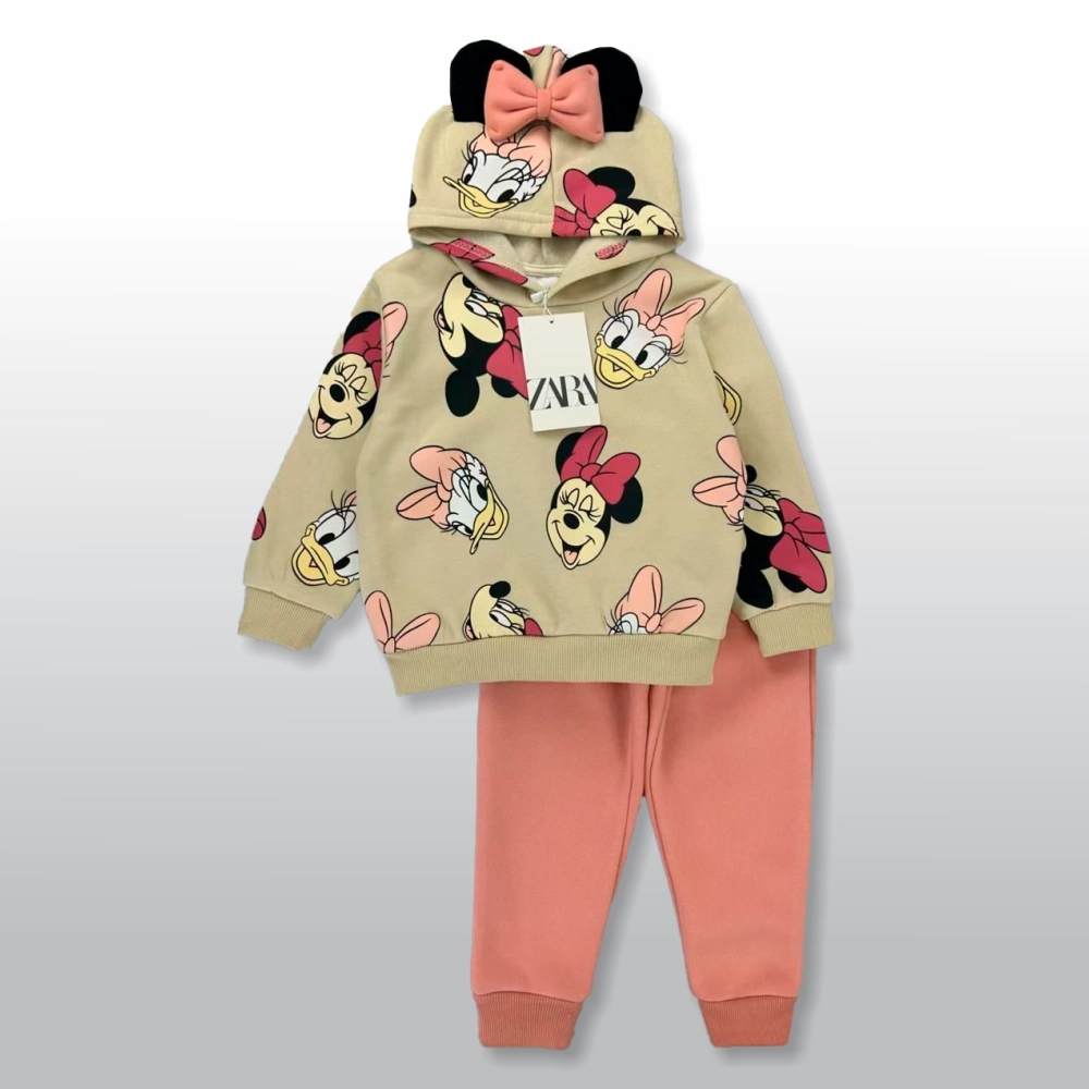 Conjunto de sudadera con capucha decorada con orejas y lazo 3D, estampada con Minnie y Daisy, más pantalón coral tipo jogger. Suave, cómodo y lleno de estilo para tu pequeña.