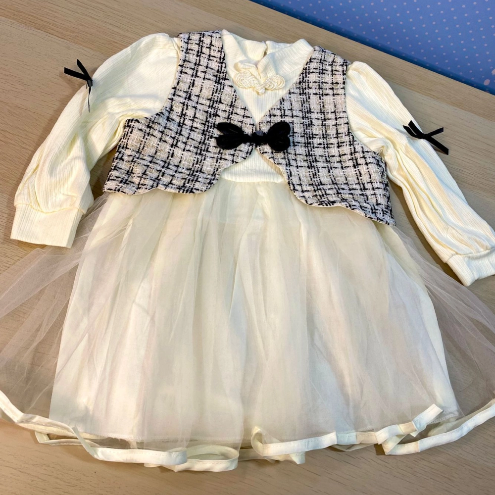 Vestido para bebé en color blanco con manga larga acanalada y falda de tul suave en tono marfil. Incluye un chaleco estilo tweed en blanco y negro con un lazo negro decorativo al frente, además de pequeños moñitos negros en las mangas. Un diseño sofisticado y moderno, ideal para eventos especiales o celebraciones familiares.